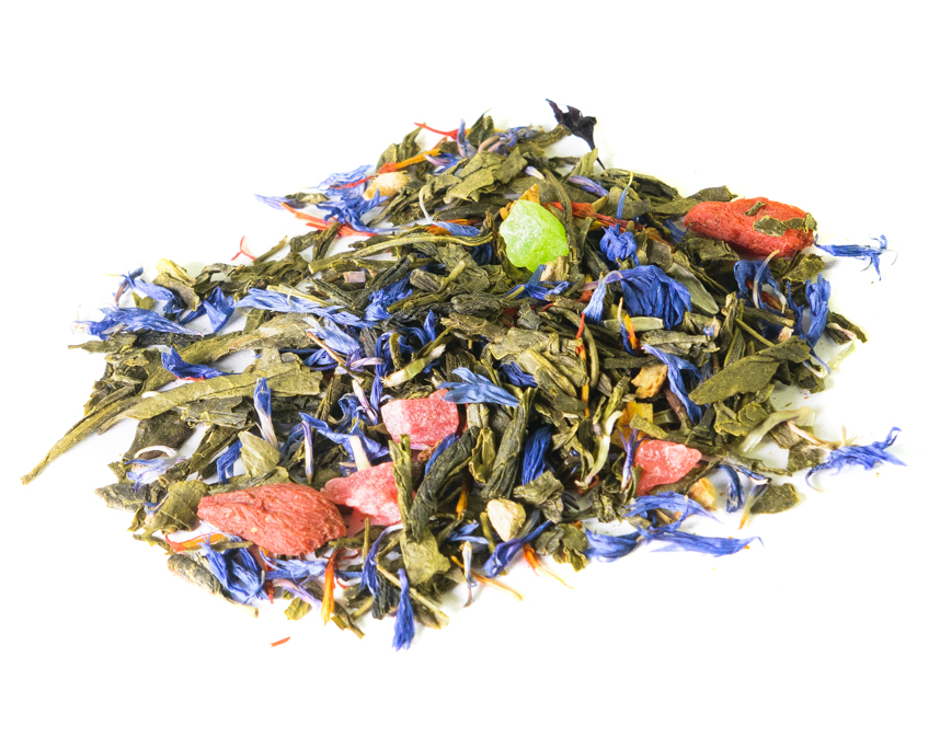 Зеленый чай "Сенча" / Ягоды годжи / Кусочки персика / Ананас / Имбирь / Мальва / Василек / Сафлор / Апельсиновая корка
